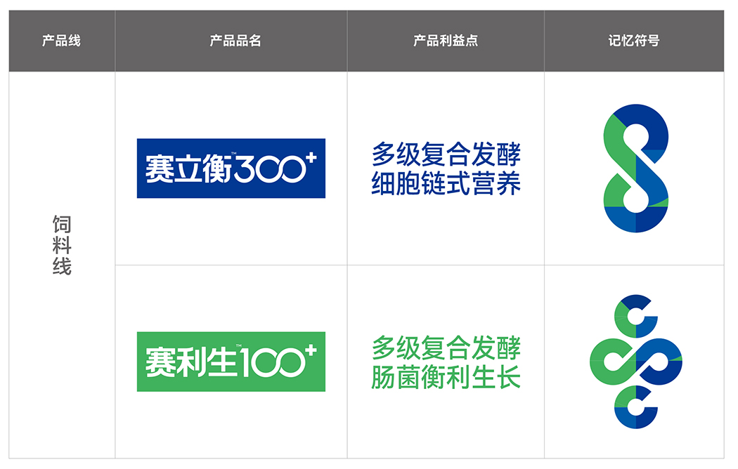 在產(chǎn)品線系列命名上,考慮到原有動保線的命名體系已成為品牌資產(chǎn)的一部分,選擇保留動保線的原命名。結(jié)合“聯(lián)結(jié)品牌 + 表達(dá)功效作用 + 易于識別傳播 + 可注冊”等命名要點,正午從品牌定位出發(fā),為創(chuàng)博原料線與飼料線產(chǎn)品重新命名。