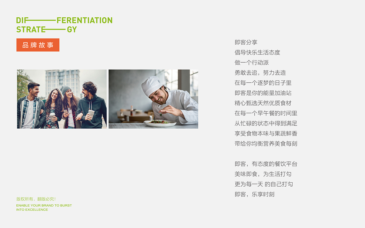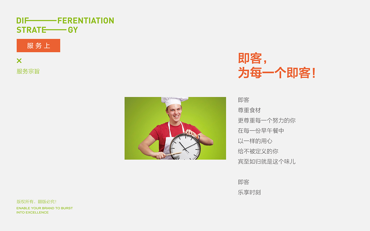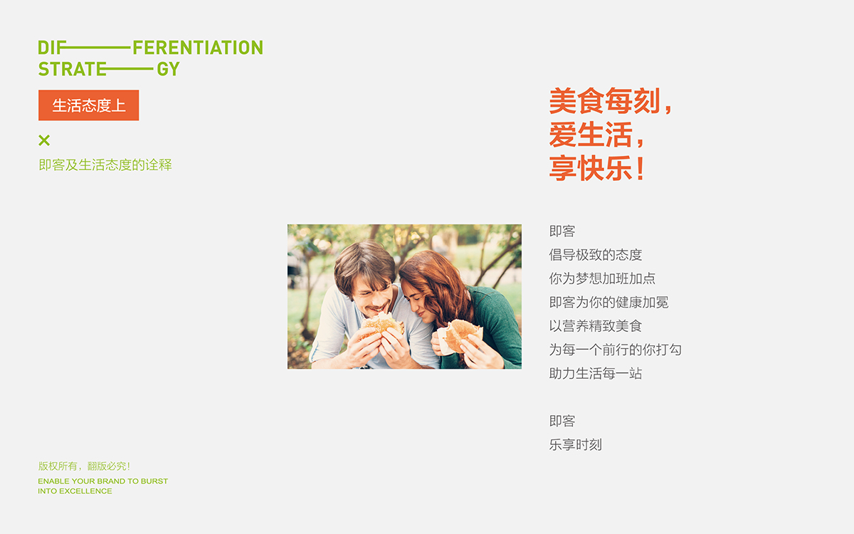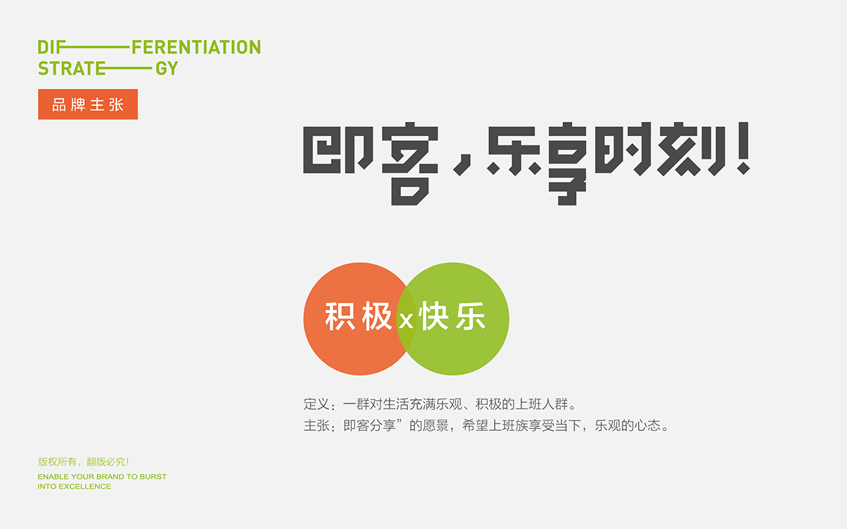即客,樂(lè)享時(shí)刻。我們定義并通過(guò)視覺(jué)化表現(xiàn)來(lái)詮釋“樂(lè)享”主張。簡(jiǎn)約、流動(dòng)、張力的視覺(jué)符合結(jié)合品牌理念和產(chǎn)品賣點(diǎn)貫穿始終,塑造出一個(gè)年輕并賦予消費(fèi)者健康快樂(lè)的品牌體驗(yàn)。